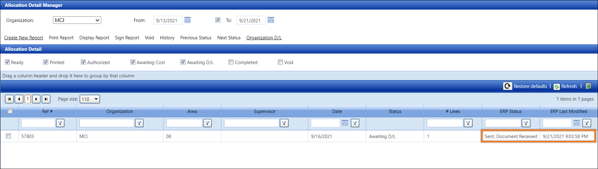 On the Allocation Detail Manager screen, users will see different ERP statuses in the Allocation Detail grid. The ERP statuses displayed under the ERP Status column will help determine if the timesheets need to be reprocessed. The ERP statuses are: