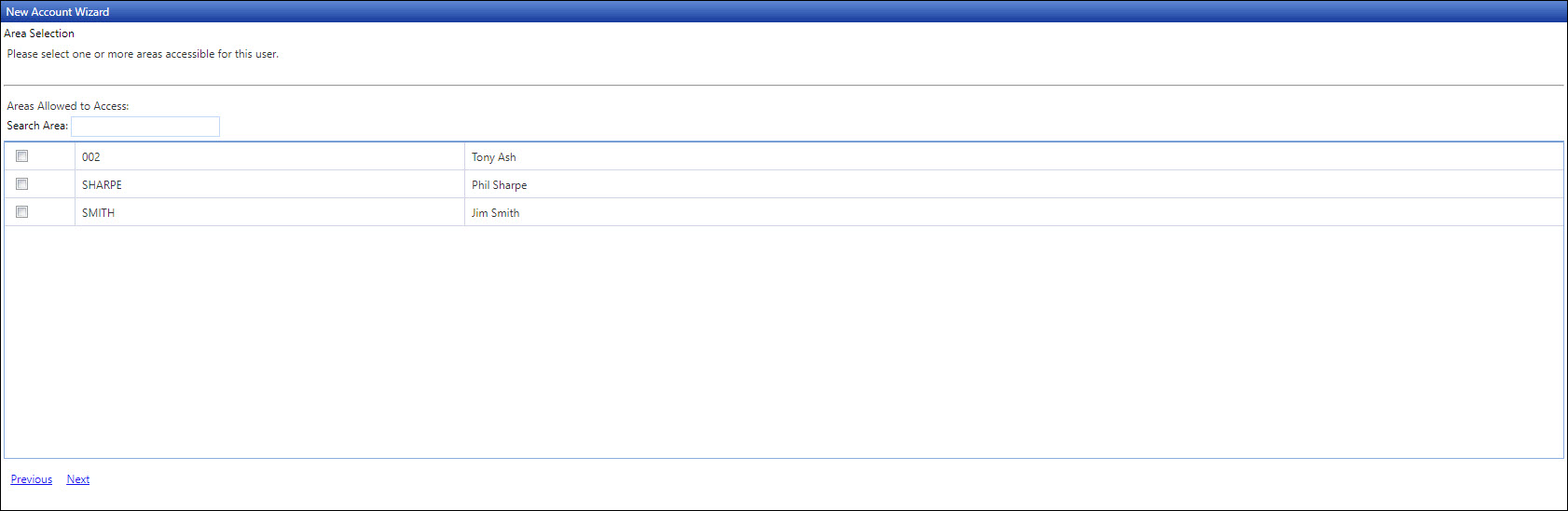 From the Area Selection screen, click only the checkboxes next to the areas that the user is allowed to have access to.