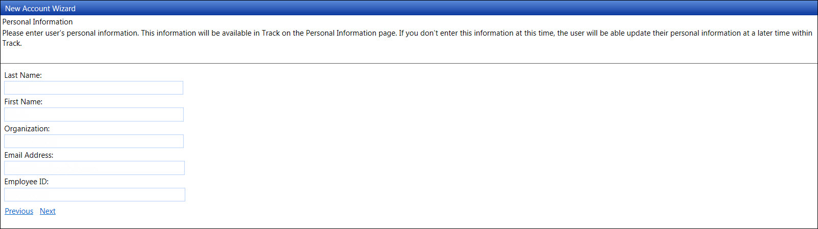 Enter the information into the Last Name, First Name, Organization, Email Address, and/or Employee ID text boxes. If the Single Sign-On feature is enabled, then the Email Address text box is a required field. Enter Track user's email into the Email Address text box.