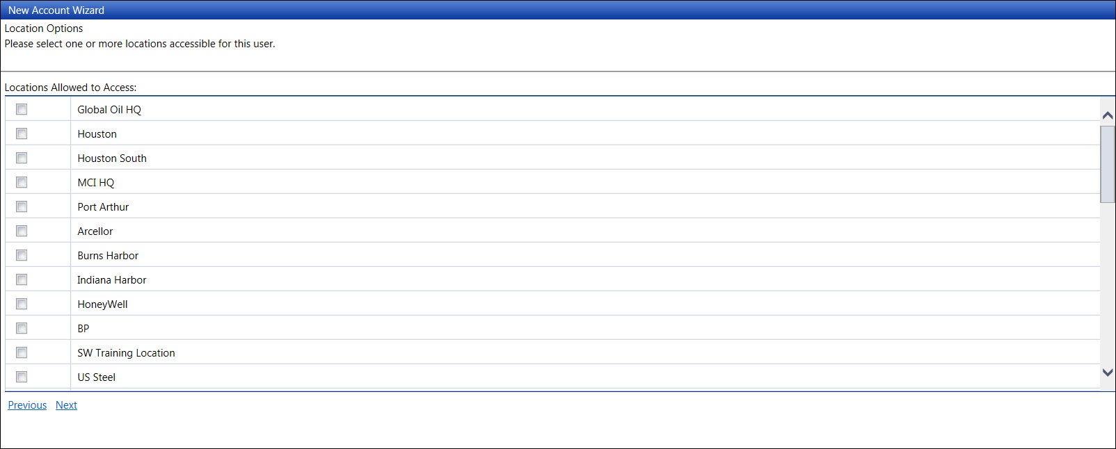 The site administrator may have access to one or more locations. From the Location Options screen, click only the checkboxes next to the locations that the user is allowed to have access to.