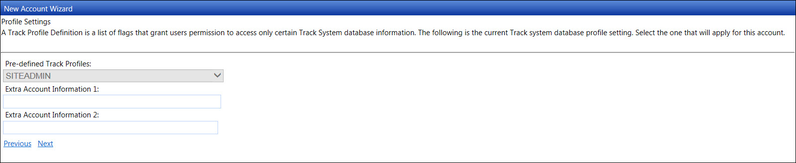 The SITEADMIN profile, in the Pre-defined Track Profiles drop-down list, is selected by default and appears as a read-only field.